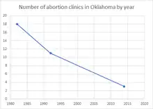 In the period between 1972 and 1974, there was one illegal abortion death in Oklahoma.[55] In the same period, the state had an illegal abortion mortality rate per million women aged 15–44 of between 0.1 and 0.9.[55] In 1990, 328,000 women in the state faced the risk of an unintended pregnancy.[34] In 2010, the state had no publicly funded abortions.[56] In 2013, among white women aged 15–19, there were 460 abortions, 110 abortions for black women aged 15–19, 0 abortions for Hispanic women aged 15–19, and 140 abortions for women of all other races.[57] In 2017, the state had an infant mortality rate of 7.7 deaths per 1,000 live births.[58]