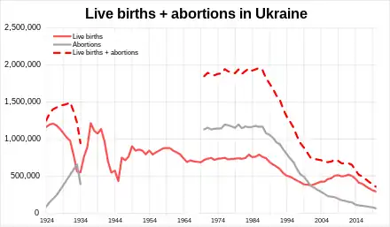 Prior to 1991, abortion in Ukraine was governed by the abortion laws of the Soviet Union. The laws have not changed since then. Abortion rates have fallen from 109 abortions per 1000 women aged 15–44 in 1986 to 80.9 in 1991, 67.2 in 1996[1] and 27.5 in 2004.[3] As of 2010, the abortion rate was 21.2 abortions per 1000 women aged 15–44.[4] In 2014 the abortion rate in Ukraine decreased to 14.89 per 1000 women aged 15–44.[5] Abortion rates in Ukraine and Belarus have converged in recent years, creating a large gap with post-Soviet Russia.[6][nb 1] In 2018, the abortion rate increased to 247 abortions per 1000 live births.[8]
