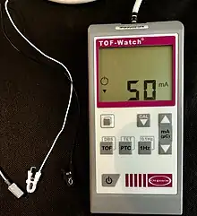 An acceleromyograph is a piezoelectric myograph, used to measure the force produced by a muscle after it has undergone nerve stimulation. Acceleromyographs may be used, during anaesthesia when muscle relaxants are administered, to measure the depth of neuromuscular blockade and to assess adequacy of recovery from these agents at the end of surgery. Acceleromyography is classified as quantitative neuromuscular monitoring.