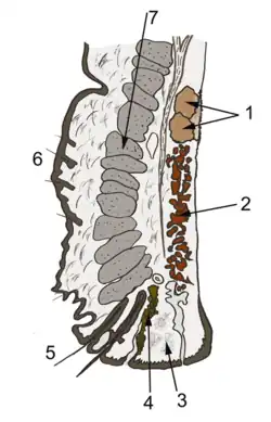 Krause's glands and Wolfring's glands (or Ciaccio's glands) are the accessory lacrimal glands of the lacrimal system of human eye.[1] These glands are structurally and histologically similar to the main lacrimal gland. Glands of Krause are located in the stroma of the conjunctival fornix, and the glands of Wolfring are located along the orbital border of the tarsal plate.[2] These glands are oval and display numerous acini. The acini are surrounded, sometimes incompletely, by a row of myoepithelial cells. Animal studies suggest that the ducts of Wolfring glands have a tortuous course and open onto the palpebral conjunctiva. Like the main lacrimal gland, the accessory lacrimal glands are also densely innervated, but they lack parasympathetic innervation. These glands are exocrine glands, responsible for the basal (unstimulated) secretion of the middle aqueous layer of the tear film.[3] 20 to 40 glands of Krause are found in the upper fornix, and 6-8 glands appear in the lower fornix.[4] There are usually 2 to 5 Ciaccio's glands, and are found along the superior tarsal border of the upper eyelid.[1] Popov’s glands are located within the substance of the caruncle.[1]