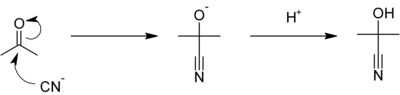 In transhydrocyanation, an equivalent of HCN is transferred from acetone cyanohydrin to another acceptor, with acetone as byproduct. The transfer is an equilibrium process, initiated by base. The reaction can be driven by trapping reactions or by the use of a superior HCN acceptor, such as an aldehyde.[9] In the hydrocyanation reaction of butadiene, the transfer is irreversible.[10]