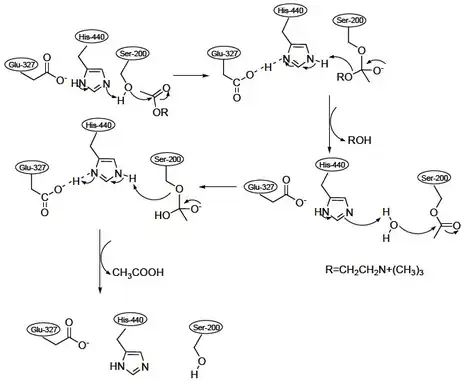 The active centre of cholinesterases feature two important sites, namely the anionic site and the esteratic site. After the binding of acetylcholine to the anionic site of the cholinesterase, the acetyl group of acetylcholine can bind to the esteratic site. Important amino acid residues in the esteratic site are a glutamate, a histidine, and a serine. These residues mediate the hydrolysis of the acetylcholine.