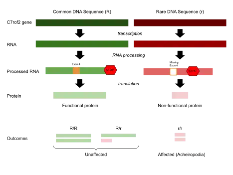 Acheiropodia results from a change in the DNA sequence of the C7rof2 gene.[11] Genes code for proteins. When this altered gene is copied for its protein instructions, the resulting instructions are processed differently from the unaltered instructions. This effectively cuts out one of the protein-coding segments called exon 4, which is needed for the final protein. The absence of this segment causes the reading of protein instructions to stop prematurely.[11] This leads to a shorter, non-functional protein.