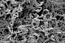 Achromobacter is a genus of bacteria, included in the family Alcaligenaceae in the order Burkholderiales. The cells are Gram-negative straight rods and are motile by using one to 20 peritrichous flagella. They are strictly aerobic and are found in water (fresh and marine) and soils.[1] They have also been identified as a contaminant in laboratory cell cultures.[2] They have been identified as opportunistic human pathogens in people with certain immunosuppressive conditions such as cystic fibrosis, cancer and kidney failure.[3]
