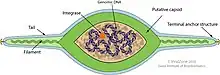 Viruses in Bicaudaviridae are non-enveloped, with lemon-shaped geometries. Genomes are circular dsDNA molecules of around 48–76 kb in length. High-resolution structure was determined by cryo-EM for Sulfolobus monocaudavirus 1 (SMV1) and a lower-resolution structure was determined for Acidianus two-tailed virus (ATV).[5] Virions of both viruses have helical symmetry, with continuous 7-start helices, composed of the single major capsid protein, forming both the tails and the spindle-shaped body. The major capsid protein structure and virion organization of bicaudaviruses are similar to those of archaeal viruses from the families Fuselloviridae, Thaspiviridae, Halspiviridae and Clavaviridae.[5]
