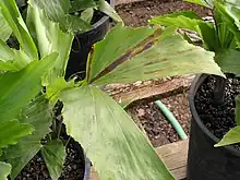 | Bacterial leaf blight of fishtail palm caused by Acidovorax avenae subsp. avenae | |