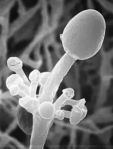 Actinomucor elegans was originally described by Schostakowitsch in Siberia in 1898 and reevaluated by Benjamin and Hesseltine in 1957.[1] Commonly found in soil[2] and used for the commercial production of tofu and other products made by soy fermentation. Its major identifying features are its spine-like projections on the sporangiophore[1] and its ribbon-like hyphal structure when found in the tissue of a host.[2]