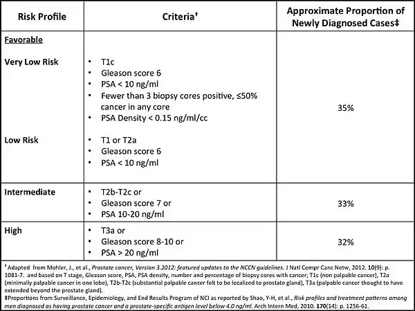 In terms of tumor metrics, natural history studies clearly demonstrate that Gleason score is a powerful predictor of the risk of disease progression and dissemination. It is therefore essential that the diagnosis reflect an accurate grade. For this, MRI-guided targeted biopsies may be superior to conventional TRUS-guided systematic biopsies; a National Institutes of Health study comparing the two biopsy approaches demonstrated that targeted biopsy results led to upgraded TRUS biopsy Gleason scores in 32% of cases, which could rule active surveillance out for those patients.[32] In addition, the supplemental risk factor information provided by both stage and PSA at diagnosis should be included in making an active surveillance decision (see table above). Finally, the preference of a patient for living with cancer or side effects of treatment should be considered in decision making.[33][34] Patients with similar disease characteristics for whom both observation and curative intervention might be reasonable, may have differing personal preferences. For some, willingness to accept a decline in quality of life to be rid of a cancer that has minimal chance of causing harm over a decade or more may seem reasonable; while others would rather live with a cancer and maintain their quality of life. An understanding of a patient's personal preferences should play a large part in shared decision making.[35]