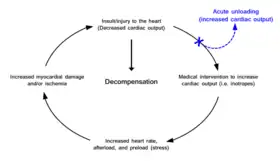 ![]() Current treatment paradigms for increasing cardiac output after the heart has been damaged often increase the stress placed on the heart and cause more damage leading to a progressive cycle into functional decompensation. Acute unloading removes the heart from this cycle by increasing cardiac output through mechanical means. | |