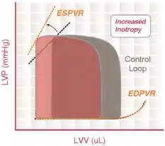 Acute cardiac unloading decreases the workload of and the oxygen demand of the heart. This can be visualized as an overall decrease in the PVA of the PV loop.[3][2] Mechanical unloading of the heart by a percutaneous ventricular support device such as the Impella device can achieve this in two ways. First, the device is a continuous flow device. It directly aspirates blood from the ventricle into the aorta. This decreases the preload and results in a left-shift and loss of the normal isovolumic contraction line.[2]