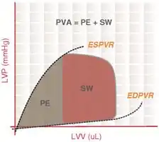 Pressure-volume (PV) loop analysis provides a framework for understanding how acute cardiac unloading reduces MVO2 in the heart.[4][5] The PV loop characterizes the events occurring during a single cardiac cycle (a single heartbeat). The total area bound by the PV loop is the mechanical energy (pressure-volume work) used to actively pump blood every beat, measured in mmHg·mL (aka, a joule ). This is known as the stroke work (SW). The remaining area bound by the ESPVR and EDPVR that is outside of the loop is the potential energy (PE) that resides in the myofilaments that was not transduced into the work of pumping blood. The sum of these two areas (PE + SW) is known as the pressure-volume area (PVA). PVA is a first order approximation of MVO2.[3]