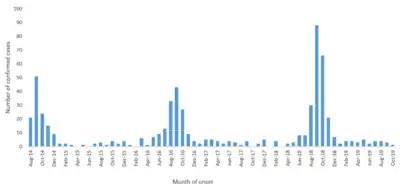 A seasonal pattern is seen in outbreaks, with a marked increase in cases reported in the late summer and early fall.[25]