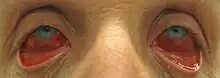 | Acute hemorrhagic conjunctivitis with the eyelid pulled down for a more complete view | |