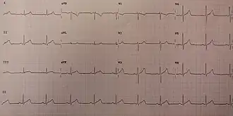 | An ECG showing pericarditis. Note the ST elevation in multiple leads with slight reciprocal ST depression in aVR. | |