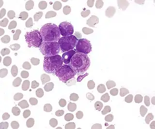 | Bone marrow smear from a patient with acute promyelocytic leukemia, showing characteristic abnormal promyelocytes.[1] | |