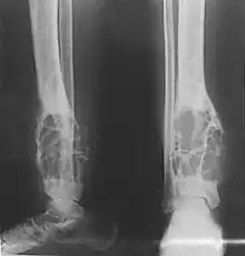 Adamantinoma (from Greek adamantinos 'very hard'[1]) is a rare bone cancer, making up less than 1% of all bone cancers.[2] It almost always occurs in the bones of the lower leg[3] and involves both epithelial and osteofibrous tissue.[4]