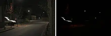In visual physiology, adaptation is the ability of the retina of the eye to adjust to various levels of light. Natural night vision, or scotopic vision, is the ability to see under low-light conditions. In humans, rod cells are exclusively responsible for night vision, as cone cells are only able to function at higher illumination levels.[1] Night vision is of lower quality than day vision because it is limited in resolution and colors cannot be discerned; only shades of gray are seen.[1] In order for humans to transition from day to night vision they must undergo a dark adaptation period of up to two hours[2] in which each eye adjusts from a high to a low luminescence "setting", increasing sensitivity hugely, by many orders of magnitude.[1] This adaptation period is different between rod and cone cells and results from the regeneration of photopigments to increase retinal sensitivity.[1] Light adaptation, in contrast, works very quickly, within seconds.