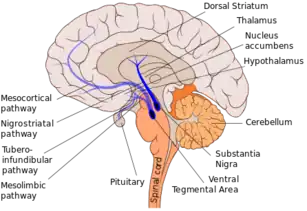 - ↑ Zhou, Q.Y.; Palmiter, R.D. (1995). "Dopamine-deficient mice are severely hypoactive, adipsic, and aphagic". Cell. 83 (7): 1197–1209. doi:10.1016/0092-8674(95)90145-0. PMID 8548806.