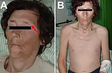 49-year-old male with an adrenal crisis. Appearance, showing lack of facial hair, dehydration, Queen Anne's sign (panel A), pale skin, muscular and weight loss, and loss of body hair (panel B).
