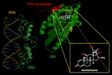 Left: DNA-binding domains of a glucocorticoid receptor homodimer in the nucleus interacting with DNA. Right: Binding of synthetic glucocorticoid dexamethasone to ligand-binding domain of receptor in cytoplasm.