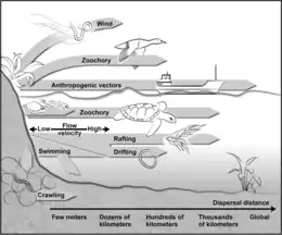 However, wind-drifted species vary in their vagility (probability to be transported with the wind),[169] with the weight and form of the propagules, and therefore, the wind speed required for their transport,[170] determining the dispersal distance. For example, in nematodes, resting eggs are less effectively transported by wind than other life stages,[171] while organisms in anhydrobiosis are lighter and thus more readily transported than hydrated forms.[172][173] Because different organisms are, for the most part, not dispersed over the same distances, source habitats are also important, with the number of organisms contained in air declining with increasing distance from the source system.[74][75] The distances covered by small animals range from a few meters,[75] to hundreds,[74] to thousands of meters.[171] While the wind dispersal of aquatic organisms is possible even during the wet phase of a transiently aquatic habitat,[164] during the dry stages a larger number of dormant propagules are exposed to wind and thus dispersed.[73][75][174] Freshwater organisms that must "cross the dry ocean" [164] to enter new aquatic island systems will be passively dispersed more successfully than terrestrial taxa.[164] Numerous taxa from both soil and freshwater systems have been captured from the air (e.g., bacteria, several algae, ciliates, flagellates, rotifers, crustaceans, mites, and tardigrades).[74][75][174][175] While these have been qualitatively well studied, accurate estimates of their dispersal rates are lacking.[76]