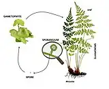 Pteridophytes are vascular plants that disperse spores, such as fern spores. Pteridophyte spores are similar to pollen grains and fungal spores, and are also components of aeroplankton.[60][61] Fungal spores usually rank first among bioaerosol constituents due to their count numbers which can reach to between 1,000 and 10,000 per cubic metre (28 and 283/cu ft), while pollen grains and fern spores can each reach to between 10 and 100 per cubic metre (0.28 and 2.83/cu ft).[41][62]