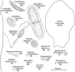 Some cause asthma, such as Alternaria alternata. A drawing of a very small "dust" seed from the flower Orchis maculata is provided for comparison.[42][43]