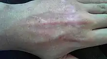 Depending on the duration of exposure aerosol-induced frostbite can vary in depth. Most injuries of this type only affect the epidermis, the outermost layer of skin. However, if contact with the aerosol is prolonged the skin will freeze further and deeper layers of tissue will be affected, causing a more serious burn that reaches the dermis, destroys nerves, and increases the risk of infection and scarring.[6] When the skin thaws, pain and severe discomfort can occur in the affected area.[7] There may be a smell of aerosol products such as deodorant around the affected area, the injury may itch or be painful, the skin may freeze and become hardened, blisters may form on the area, and the flesh can become red and swollen.