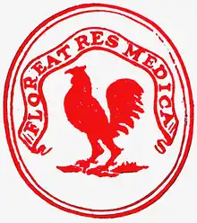 There were 10 founding members of the Club who attended the first dinner on 2 April 1773.[4] The minutes of that meeting record that 'The Aesculapian Club was conceived in a happy moment, and in due time brought forth. Doctors Duncan and Hamilton, Messrs Hay, Bell, McLure, and Dewar assisted at the birth on the first Friday of April 1773. They also stood as godfathers at the christening. The usual rites and ceremonies usual on these occasions, such as eating a good supper, etc., were concluded with a bumper recommendatory of the club to the peculiar care of Apollo, of Bacchus, and of Venus, Floreat Res Medica. Vivat Veritas.' The club was named after Asclepius, the Greek God of medicine, more usually known by the Roman name, Aesculapius. Aesculapius was the son of Apollo, who was himself both the God of physic and the sender of disease.[6] The badge of the Club consists of the Latin motto 'Floreat Res Medica' (Let the medical field flourish) and a cockerel. Cockerels adorn many of the fixtures and fittings of the Royal College of Physicians of Edinburgh.[7] In Greek mythology cockerels were dedicated to Apollo (because their crowing gave notice of the rising sun) and to Aesculapius (because their example of 'early to bed and early to rise' was associated with good health).[8]
