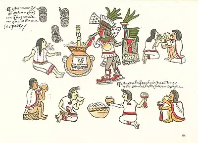 Pulque was drunk by Aztec priests and their sacrificial victims, to increase the priests' enthusiasm and to ease the suffering of the victim.[40] Among commoners, it was permitted only to the elderly and pregnant or lactating women[41] due to the association between pulque and fertility, purification and renewal.[42] Production of pulque was ritualized and the brewers would abstain from sex during the fermentation period.[43] During most festivals, participants were not permitted to drink more than four cups of pulque,[44] and Aztec folklore describes the likely fate of people who drank too much, including death by disease or accident.[45] Exaggerated tales of the Huastec people characterized them as habitual drunkards and detailed their shameful behavior under the influence of alcohol, in an effort to discourage drunkenness among the Aztecs.[46] Elderly Aztecs who had reached the age of 70 and had raised families could drink as much as they wanted, as long as their children carried them home safely, keeping them covered up and "restraining and guiding" them so they would avoid "committing excesses and transgressions," and not fall "into a river or a hole."[44] Drunkenness was also viewed as a means of establishing communication between humans and the gods, and was therefore not considered appropriate for commoners. Alcoholic intoxication was seen as an act of transcending the boundaries of human, divine and natural forces, one that should only be done by accomplished, brave and important members of society so as to avoid offending the supernatural world.[42] Among the Maya, pulque was referred to as chih and was flavored with honey and spices.[47]