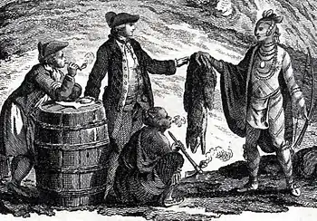 When Europeans began making a large quantity of distilled spirits and wine available to Native Americans, the tribes had very little time to adapt and develop social, legal, or moral guidelines to regulate alcohol use.[56] Early traders offered alcohol in trade, exchanging it for highly sought-after animal skins and other materials and resources.[57] Traders also discovered that giving free alcohol to Native Americans during trading sessions gave them a distinct advantage during negotiations.[58] Extreme intoxication was common among the colonists, contrary to the inexperienced native populations.[56]