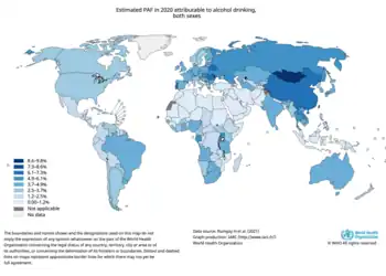 Alcoholic beverages were classified as a Group 1 carcinogen by the International Agency for Research on Cancer (IARC) in 1988.[3] An estimated 3.6% of all cancer cases and 3.5% of cancer deaths worldwide are attributable to consumption of alcohol (more specifically, acetaldehyde, a metabolic derivative of ethanol).[8] 740,000 cases of cancer in 2020 or 4.1% of new cancer cases were attributed to alcohol.[3][2]