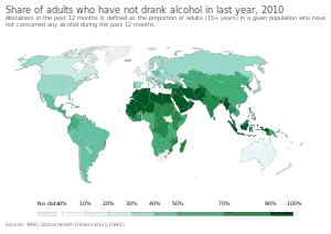 Teetotalism is the practice of never consuming alcohol, specifically in alcoholic drinks. A person who practices (and possibly advocates) teetotalism is called a teetotaler (US) or teetotaller (UK), or said to be teetotal. Globally, in 2016, 57% of adults did not drink alcohol in the past 12 months, and 44.5% had never consumed alcohol.[7] A number of temperance organisations have been founded in order to promote teetotalism and provide spaces for non-drinkers to socialise.[8]