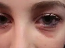 An allergic shiner is a dark discoloration below the eye that is associated with allergic rhinitis and is often seen in conjunction with bilateral Dennie–Morgan folds. These shiners are caused by venous congestion within the infraorbital groove, particularly from the nose. The characteristic infraorbital discoloration related to allergic shiners is due to a backup in the venous network supplying the mucous membranes of the paranasal and nasal cavities draining primarily via the branches of the sphenopalatine veins passing backward to the pterygoid plexus.[1] While a classic finding in pediatric patients with allergic rhinitis, these particular shiners will persist into adulthood if their allergies are not successfully addressed. The phenomenon was first documented in 1930, with the phrase being coined in 1954.[2][3]