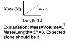 To find the expected slope for the relationship between mass and the characteristic length of an animal (see figure), the units of mass (M) from the y-axis are divided by the units of the x-axis, Length (L). The expected slope on a double-logarithmic plot of L3 / L is 3 (). This is the slope of a straight line.