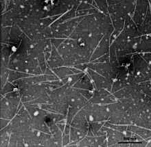 | Electron micrograph of narcissus mosaic virus (NMV) filamentous virions | |