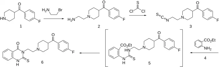 The reaction of 4-(4-fluorobenzoyl)piperidine [56346-57-7] (1) with 2-bromoethylamine [107-09-5] gives [1-(2-aminoethyl)piperidin-4-yl]-(4-fluorophenyl)methanone [83763-22-8] (2). The reaction of the terminal amino group with thiophosgene [463-71-8] leads to the corresponding isothiocyanate derivative, 4-fluorophenyl 1-(2-isothiocyanatoethyl)piperidin-4-yl ketone [84946-22-5] (3). Upon reaction of this reactive intermediate with ethyl anthranilate [87-25-2] (4), the transient addition product might be expected to be initially formed (5'). An intramolecular lactamization to the heterocyclic ring then occurs giving altanserin (6).