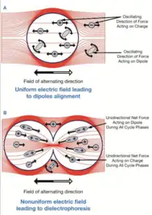 All living cells contain polar molecules and will respond to changes in electric fields.[7] Alternating electric field therapy, or Tumor Treating Fields (TTFields) use insulated electrodes to apply very-low-intensity, intermediate-frequency alternating electrical fields to a target area containing cancerous cells.[7] Polar molecules play a key role in cell division, making mitosis particularly susceptible to interference from outside electric fields. TTFields disrupt dipole alignment and induce dielectrophoresis during mitosis, killing proliferating cells.[6][11][12][13][14][15]