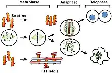 Polar molecules critical to mitosis include α/β-tubulin and the mitotic septin heterotrimer.[15] Tubulin is necessary for mitotic spindle formation during metaphase, while septins stabilize the cell during cytokinesis. When exposed to TTFields, these molecules align their dipole with the electric field, freezing them in one orientation. This prevents tubulin and septin molecules from moving to and binding where they are needed for successful cell division.[16] This results in mitotic catastrophe, initiating cell death through apoptosis.[16] Uneven chromosome splitting can also be a result of TTFields' effect on dipole alignment, resulting in daughter cells with abnormal chromosome numbers.[7][17]