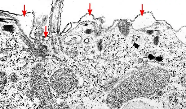 In one school of thought the common ancestor of the dinoflagellates, apicomplexans, Colpodella, Chromerida, and Voromonas was a myzocytotic predator with two heterodynamic flagella, micropores, trichocysts, rhoptries, micronemes, a polar ring and a coiled open sided conoid.[24] While the common ancestor of alveolates may also have possessed some of these characteristics, it has been argued that Myzocytosis was not one of these characteristics, as ciliates ingest prey by a different mechanism.[13]