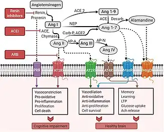 The renin-angiotensin system (RAS), which is involved in blood pressure regulation, plays a unique and important role in the brain.[17] The RAS system involves the proteins angiotensinogen, renin, and ACE, all of which are present in the brain.[18] Renin is an enzyme that cleaves angiotensinogen into angiotensin I (Ang I), while ACE converts Ang I into Ang II.[18] Ang II can either bind to the angiotensin II type 1 receptor (AT1R), which promotes inflammation and damages neurons, or the AT2R, which reduces inflammation and protects neurons.[18] At higher levels of Ang II, the AT1R is preferably activated, causing inflammation, decreased blood flow to the brain, and cognitive impairment in the long term.[18] Ang II can be cleaved by ACE2 into more neuroprotective species, such as Ang III and IV, which counteract the effect of Ang II.[18] In AD, AT1R signaling has been shown to be increased, contributing to neurodegeneration and cognitive impairment.[29]