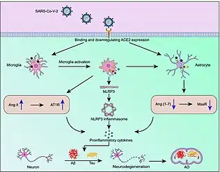 Studies have shown involvement of the NLRP3 inflammasome in AD.[21] The expression of genes related to inflammasome activation were shown to be increased in AD, while stimulation of immune cells with Aβ42 can directly activate it.[21] Aβ plaques and oligomers can function similar to DAMPs, priming and activating the NLRP3 inflammasome. Additionally, Aβ that has been phagocytosed by microglia can damage lysosomes, cellular structures containing waste, causing release of cathepsin B, an endogenous molecule that can activate the NLRP3 inflammasome.[21] Consequently, activation of the NLRP3 inflammasome prevents microglia from ingesting Aβ42, creating a positive feedback loop towards neuroinflammation as Aβ buildup can further activate additional inflammasomes.[21] NLRP3 activation can also arise from hyperphosphorylated tau, and can consequently lead to additional tau phosphorylation. This chronic activation of the NLRP3 inflammasome ultimately contributes to chronic inflammation and neurodegeneration in AD. Being a virus, SARS-CoV-2 can activate the NLRP3 inflammasome, triggering inflammation required to fight infection.[22] It is through this mechanism that SARS-CoV-2 is thought to increase deposition of toxic Aβ42 and hyperphosphorylated tau, worsening AD pathology. The subsequent increase in inflammatory cytokines can further lead to neurodegeneration and cognitive impairment.