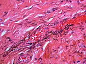 Over time, the amalgam particles embedded in the soft tissues corrode.[5]: 183 Macrophages take up the exogenous particles, and the silver in amalgam leads to staining of collagen fibers.[5]: 183