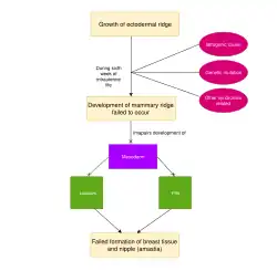 Amastia is presumably due to failure of embryologic (before birth) mammary ridge development or incomplete involution. People with amastia often suffer from ectodermal defects, which include various syndromes such as cleft palate, isolated pectoral muscle and abnormal formation of the arms.[4]