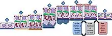![]() The cervical loop area: (1) dental follicle cells, (2) dental mesenchyme, (3) odontoblasts, (4) dentin, (5) stellate reticulum, (6) outer enamel epithelium, (7) inner enamel epithelium, (8) ameloblasts, (9) enamel. | |