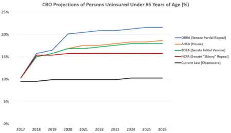 According to each of the CBO scores, passage of the Republican bills would result in a dramatic reduction in the number of persons with health insurance, relative to current law.[20][29]