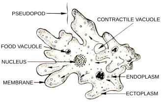 Historically, researchers have divided the cytoplasm into two parts, consisting of a granular inner endoplasm and an outer layer of clear ectoplasm, both enclosed within a flexible plasma membrane.[13] The cell usually has a single granular nucleus, containing most of the organism's DNA . A contractile vacuole is used to maintain osmotic equilibrium by excreting excess water from the cell (see Osmoregulation).