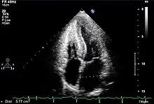 Amyloid cardiomyopathy (stiff heart syndrome)[5] is a condition resulting in the death of part of the myocardium (heart muscle). It is associated with the systemic production and release of many amyloidogenic proteins, especially immunoglobulin light chain or transthyretin (TTR).[6] It can be characterized by the extracellular deposition of amyloids, foldable proteins that stick together to build fibrils in the heart.[7]