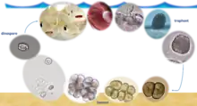 Two to six days after feeding, the trophont detaches from the host and encysts on inert substrates (pond/tank bottom or seabed) transforming into the tomont: the reproductive stage. In this phase, the protozoan is round and encapsulated in a cellulose wall, which becomes thicker and confers upon it an exceptional resistance to unfavourable conditions and to several therapeutic treatments. The protozoan reproduces asexually, the first division is longitudinal while the succeeding ones are approximately regular and at right angles to each other. Potentially, in two to four days, from a single tomont, 256 new dinospores can be generated. The number of newly formed dinospores is directly correlated to the nutritive state of the trophont.[4]