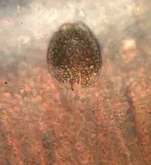 The parasitic stage is represented by the sessile trophont. In this phase, the protist is pear-shaped, enclosed in a cellulose wall and exhibits specific structures, rhizoids (tentacle like processes) that enable it to strictly anchor to host epithelia (gill or skin predominantly). If the infection is severe, trophonts can also be found on eyes, fins and in all oropharyngeal cavity, the latter is a typical infection site in the European seabass (Dicentrarchus labrax). Constantly moving while anchored and therefore causing physical injuries to cells, trophonts inflict serious damages to the host, potentially inducing its death in 12-48 hours as a function of the parasite burden. Based on data in the literature, the trophont feeds directly from the host cells, probably using the stomopode by releasing digestive enzymes,[3] which exacerbate the rhizoid lesions. Trophont size can vary considerably, with early trophonts measuring 27×23 μm while mature ones can reach up to 130×60 μm and more.